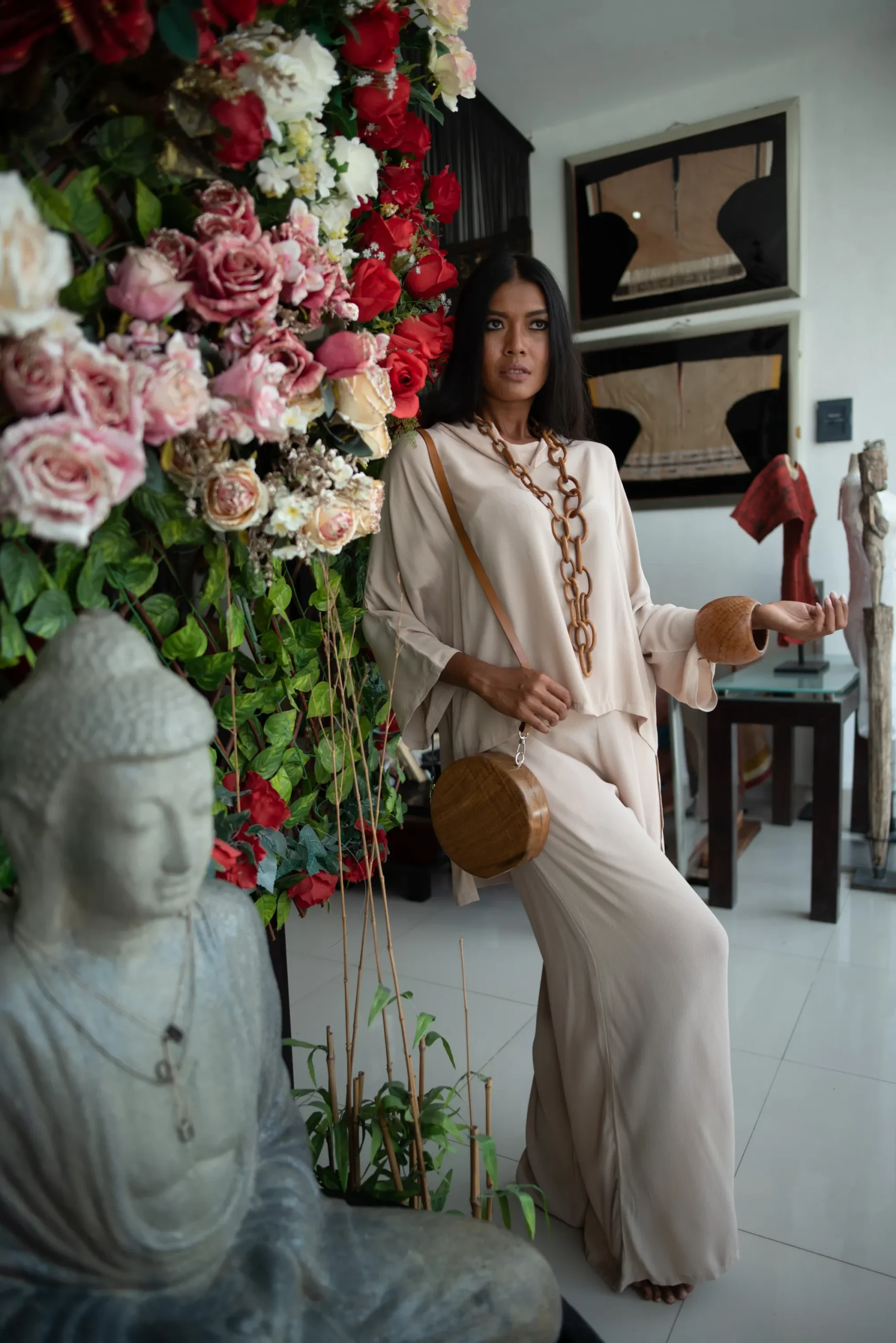 Complete your look with the Lineda Wide-Leg Pants, designed in the same soft nude viscose as the matching tunic. Light, elegant, and breezy, these pants bring comfort and style together in perfect balance.